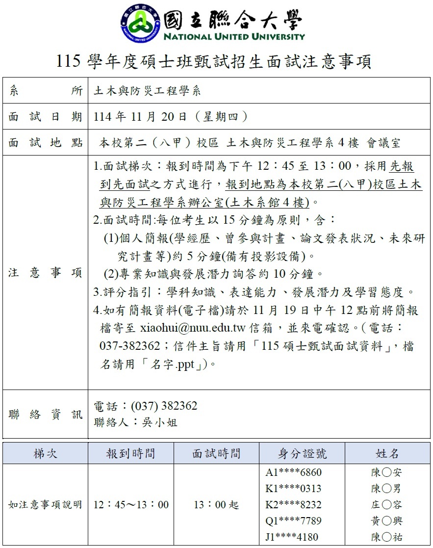 【系所招生】國立聯合大學土木與防災工程學系_115學年度碩士班甄試招生面試注意事項(面試日期:114年11月20日)