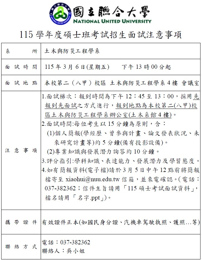 【系所招生】115學年度碩士班考試招生面試注意事項